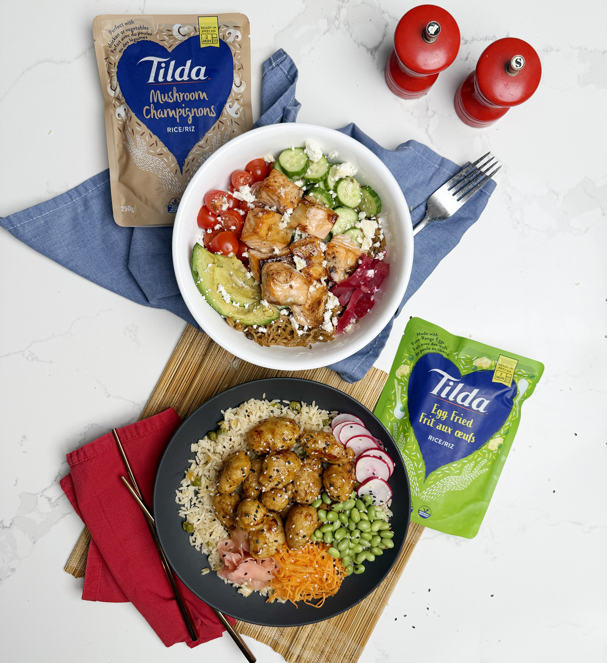 Bol coloré au saumon et riz aux champignons avec Tilda Champignons Riz